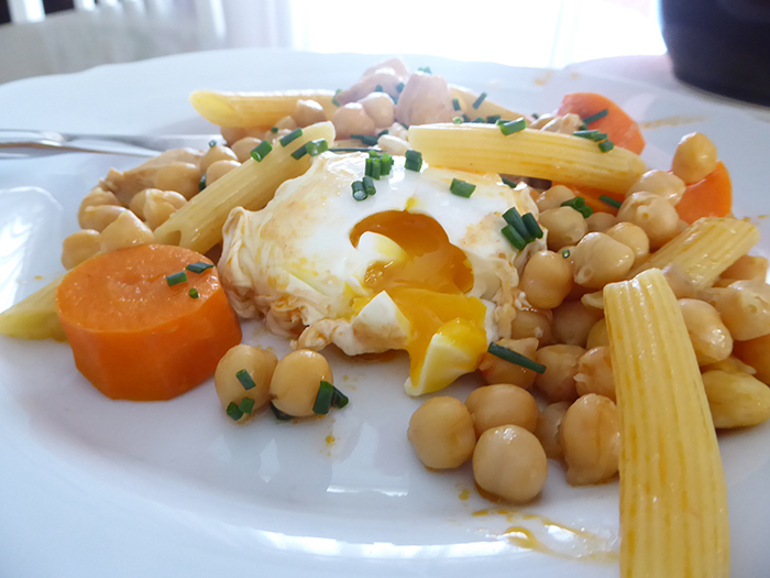 Grão com Massa, Frango e Ovo Escalfado